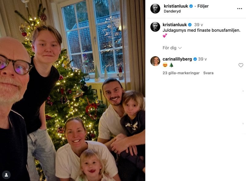 "Juldagsmys med finaste bonusfamiljen", skriver Kristian till en bild där både Holger, Carina och Erik Berg samt deras barn Otto och Juno syns umgås tillsammans med Kristian.