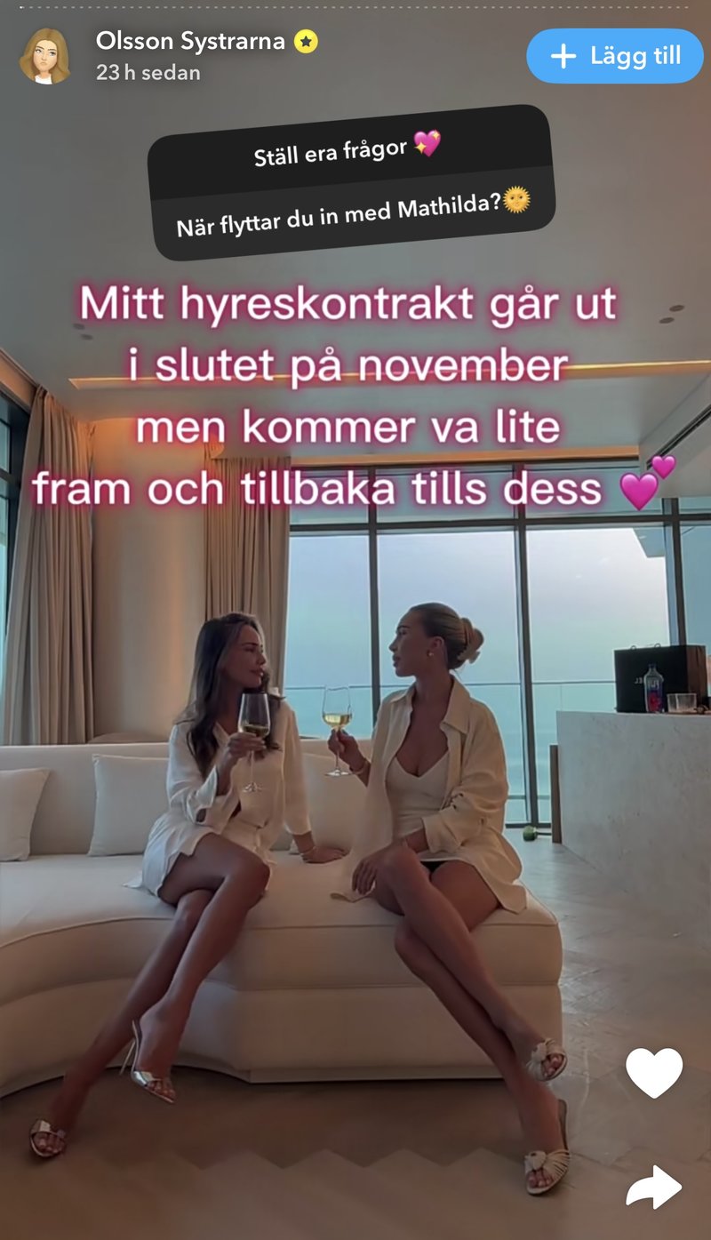 Mathilda Olsson bor i Dubai. Hon flyttade nyligen in i en ny lägenhet med utsikt över den kända ön "The Palm", där hennes syster Johanna även ska flytta in i inom en snar framtid:
