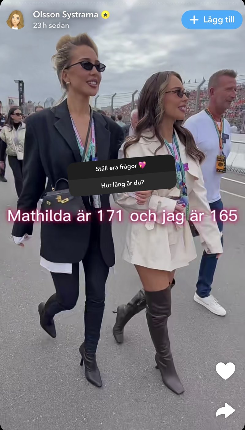 Det är många som undrar över Mathilda Olssons längd. På Snapchat har hennes syster tidigare svarat att Mathilda är 171 centimeter lång, och att storasyster Johanna är 165 centimeter lång.